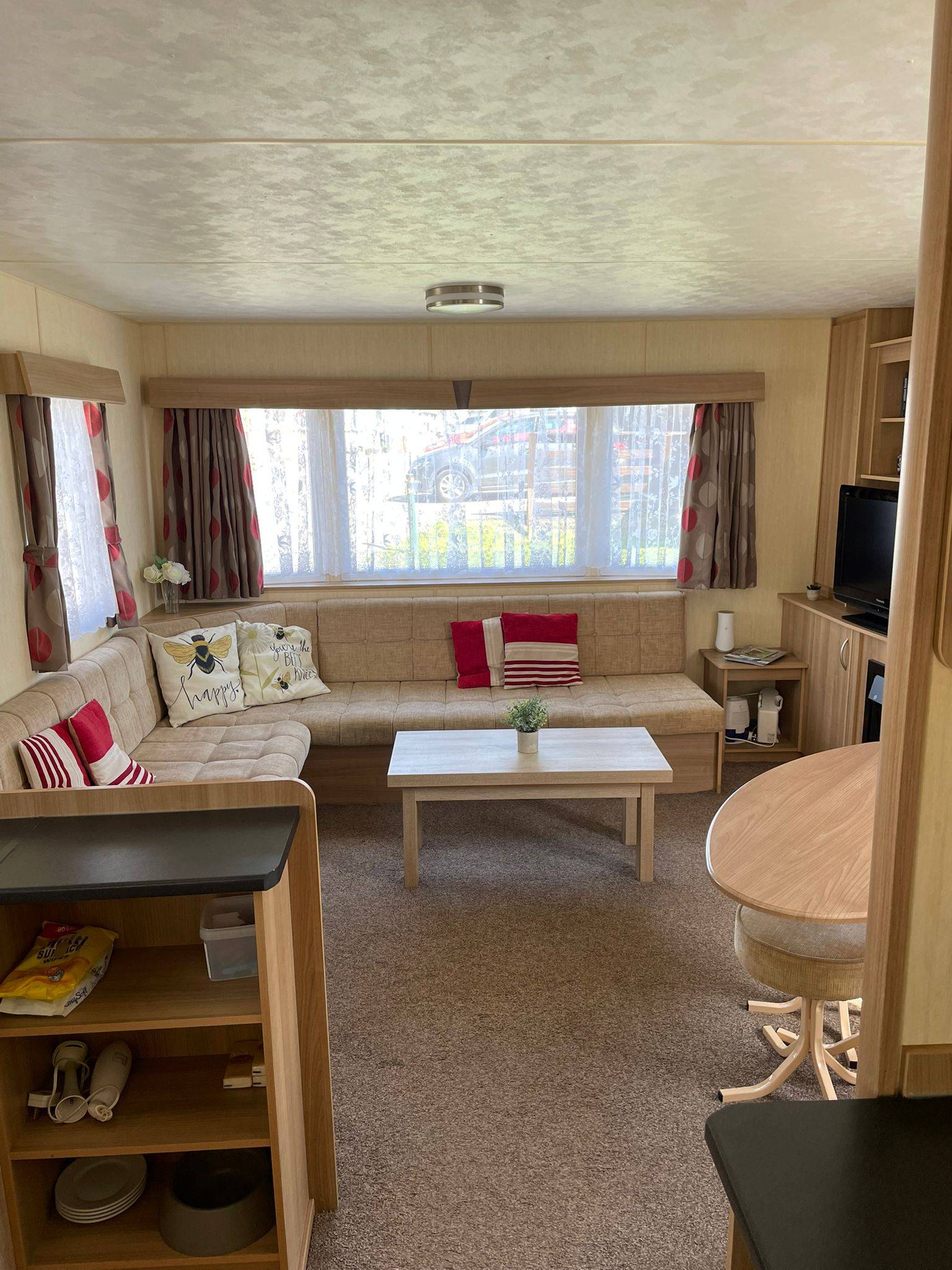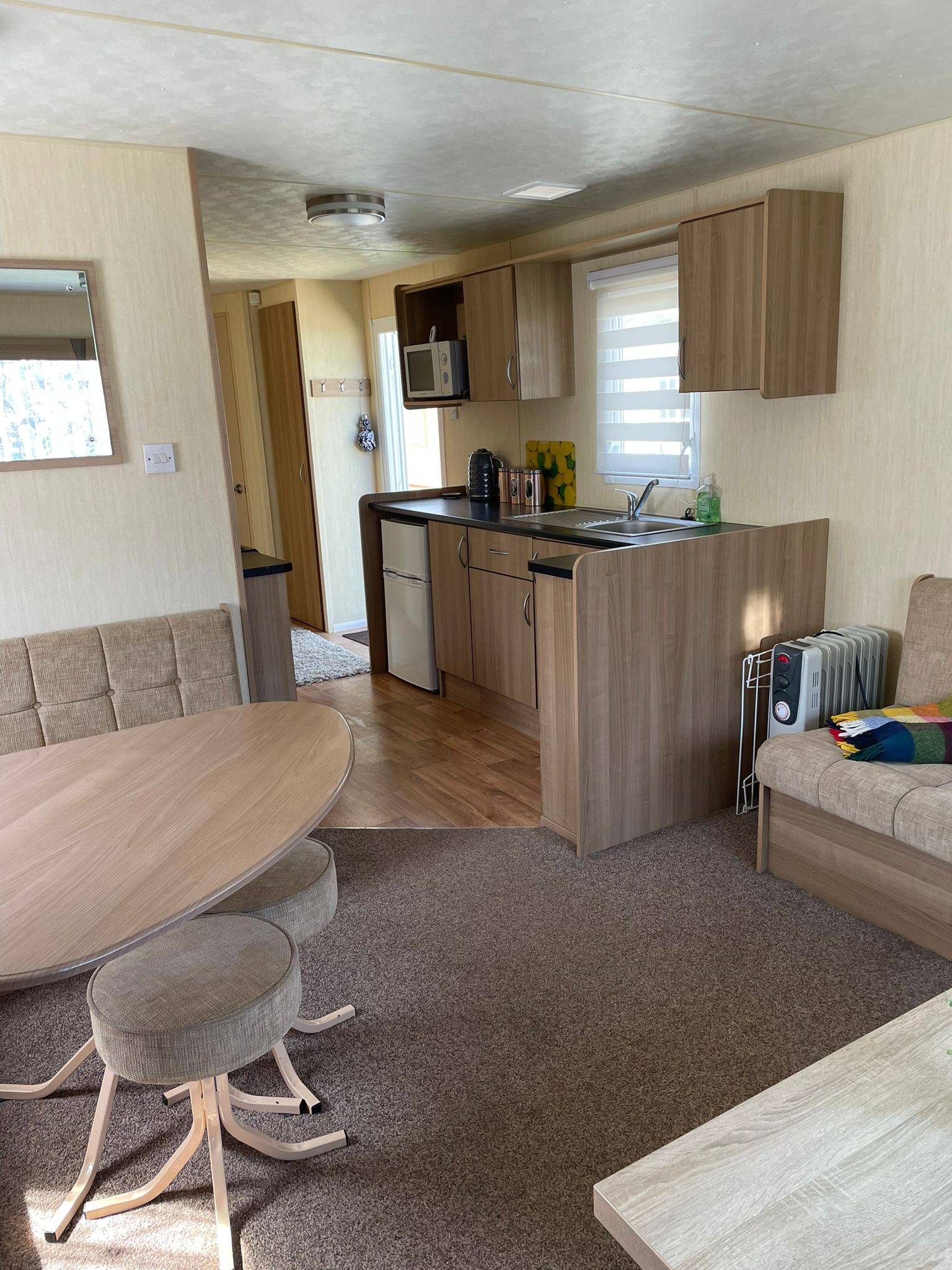 Inside, you will find a bright open plan living area with comfortable seating, a dining space, and a fully equipped kitchen ready for self catering stays. Large windows bring in natural light, creating a warm and homely atmosphere throughout.